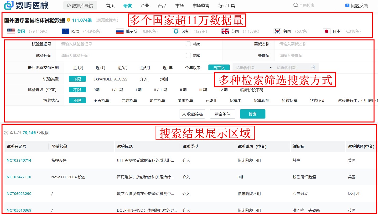此外还可以通过数屿医械-国外医疗器械临床试验数据库,一站式查看国外多个国家临床试验数据
