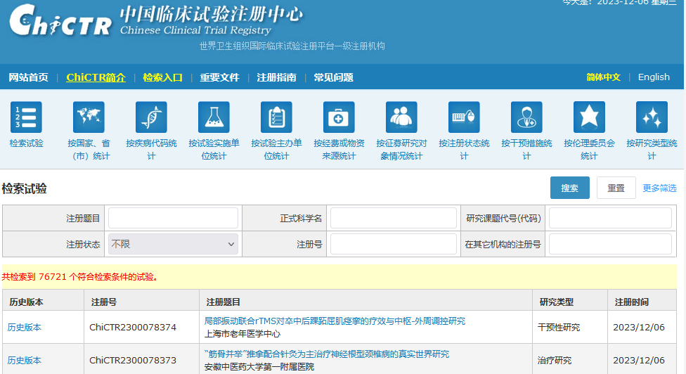1.中国ChiCTR临床试验注册中心——药物及器械临床试验数据综合查询
