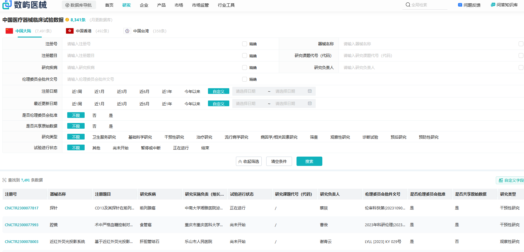 查询时,可通过注册号、器械名称、题目、代码、疾病、研究负责人等条件进行精准检索,或是通过注册日期、研究类型、进行状态进行条件范围内的全量搜索。