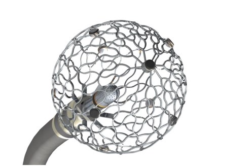 Affera 的 Sphere-9 标测和消融导管(如图)可以提供射频消融和 PFA 来治疗 AFib。与 Sphere-360 一样,Sphere-9 使用其镍钛合金上层结构作为单个电极来提供烧蚀能量。