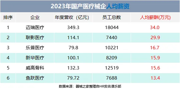日前,“HR实名俱乐部”对国内医疗械企的员工薪资进行了统计数据。器械之家将根据该数据深入分析迈瑞、联影、乐普、新华、威高骨科、鱼跃医疗这6家国内领先医疗器械企业的员工薪酬情况,看看哪些公司在薪酬待遇上更具竞争力。