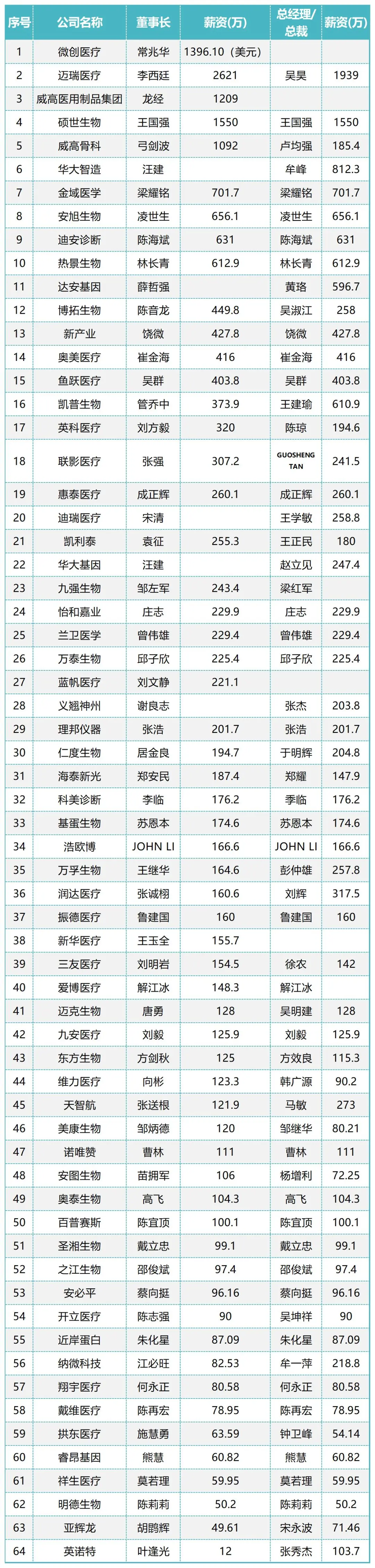 那么,各家医疗器械企业一把手的年薪收入有多少呢?根据企查查数据,整理了64家医械企业的董事长、总经理/总裁薪资,披露时间差异在2021至2023年不等。