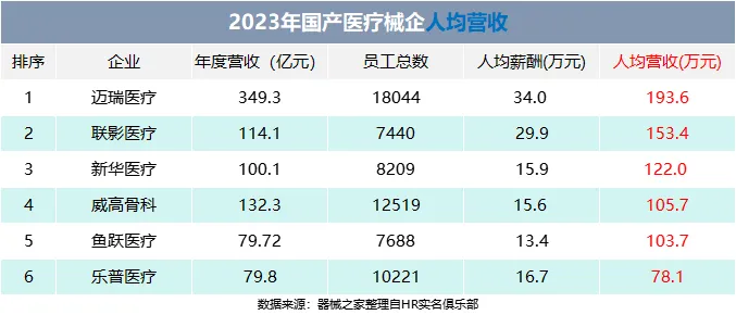 第三名乐普医疗员工平均薪酬16.7万元,公司年度营收79.8亿元,排位第5。值得注意的是,乐普医疗的员工总数以及人均薪资超过了大部分营收百亿的械企。