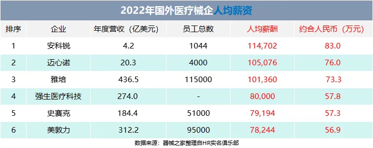 作为参考,器械之家还整理了2022年国外医疗械企的平均薪酬榜单。