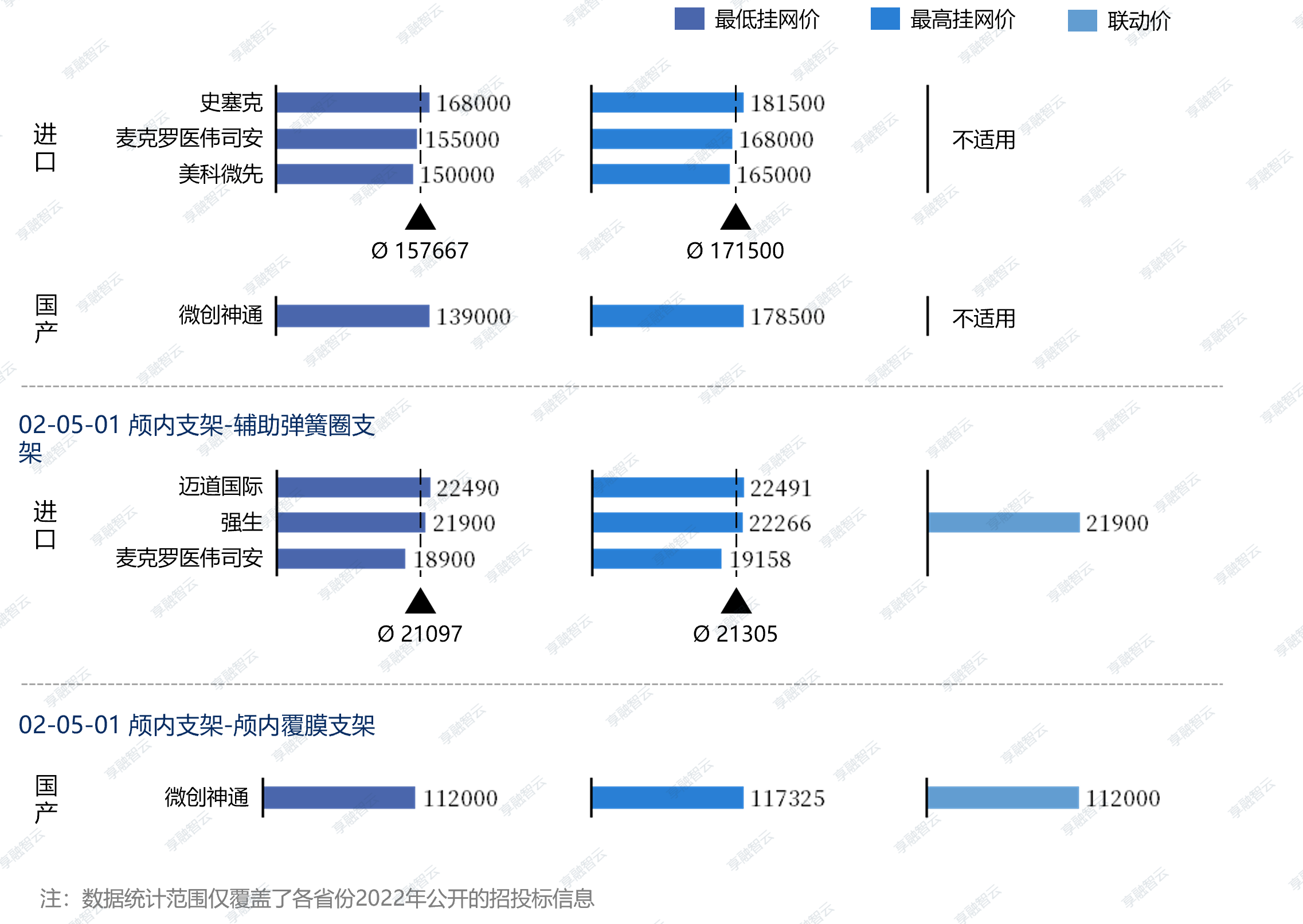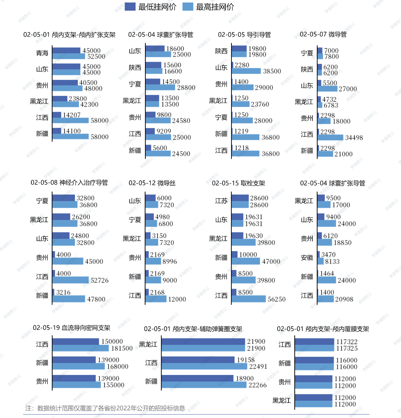 根据各省份2022年已公开的招投标信息,分别获取了4、3、1家血流导向密网支架辅助弹簧圈支架、颅内覆膜支架厂家的产品定价信息。