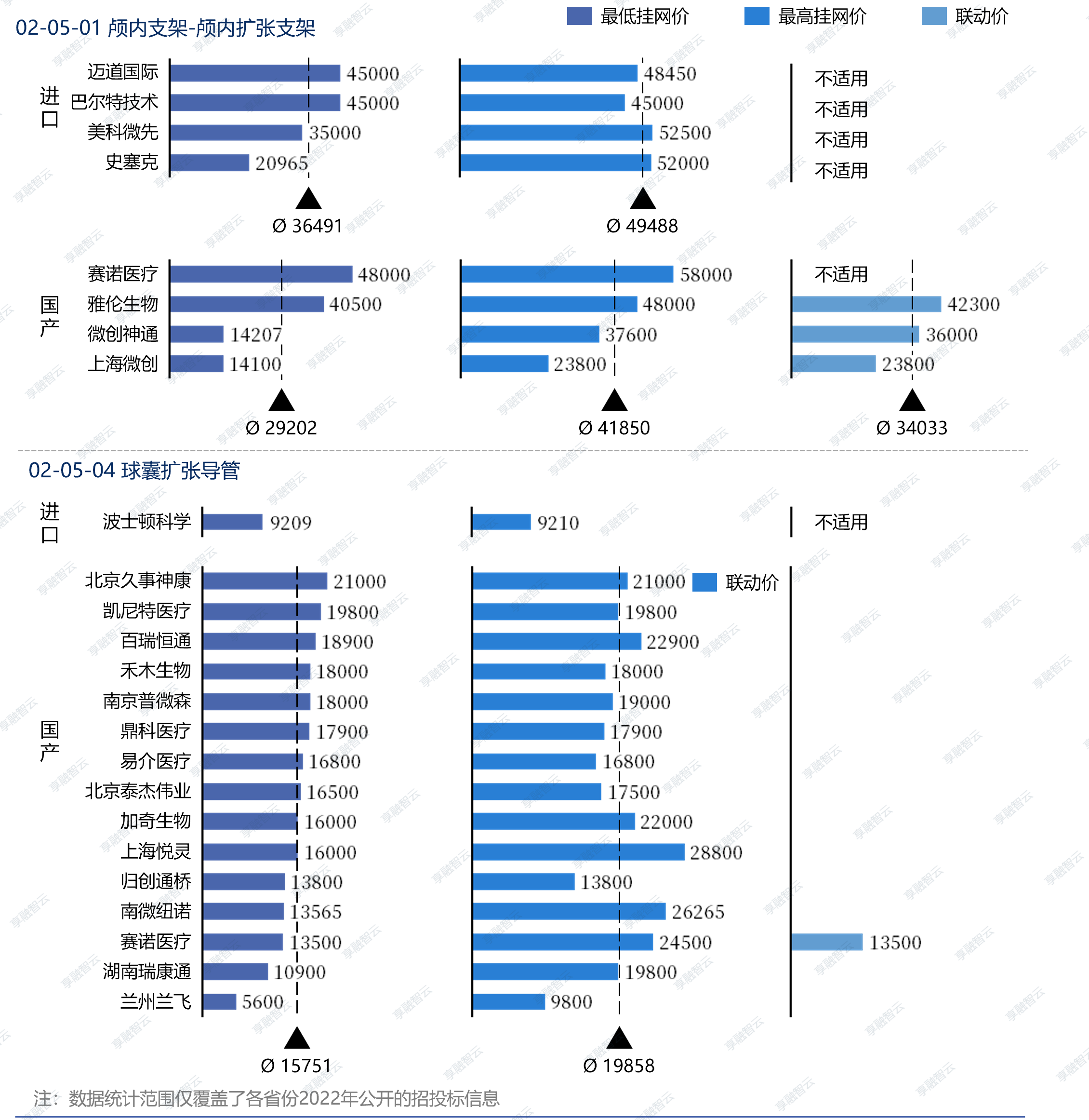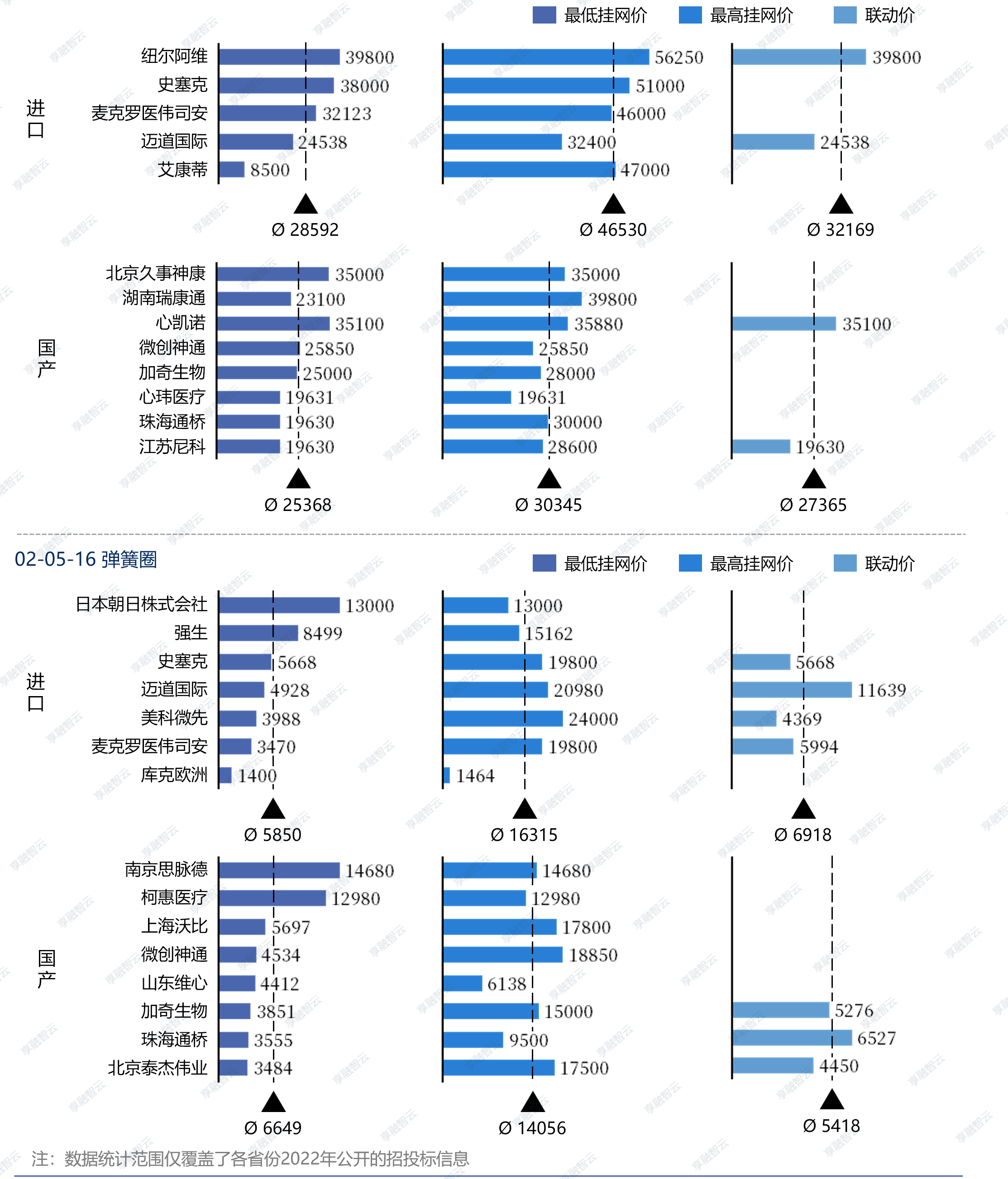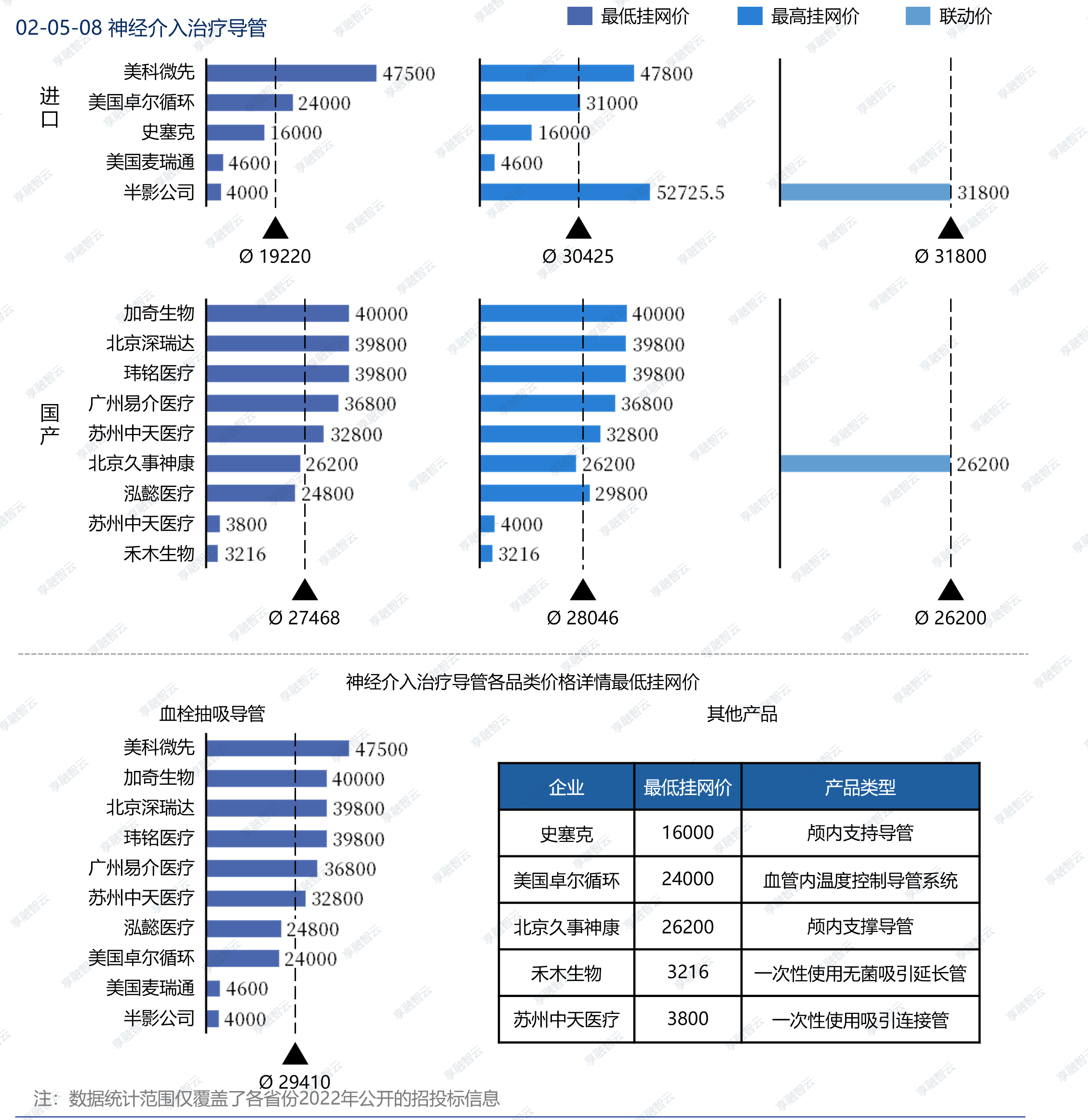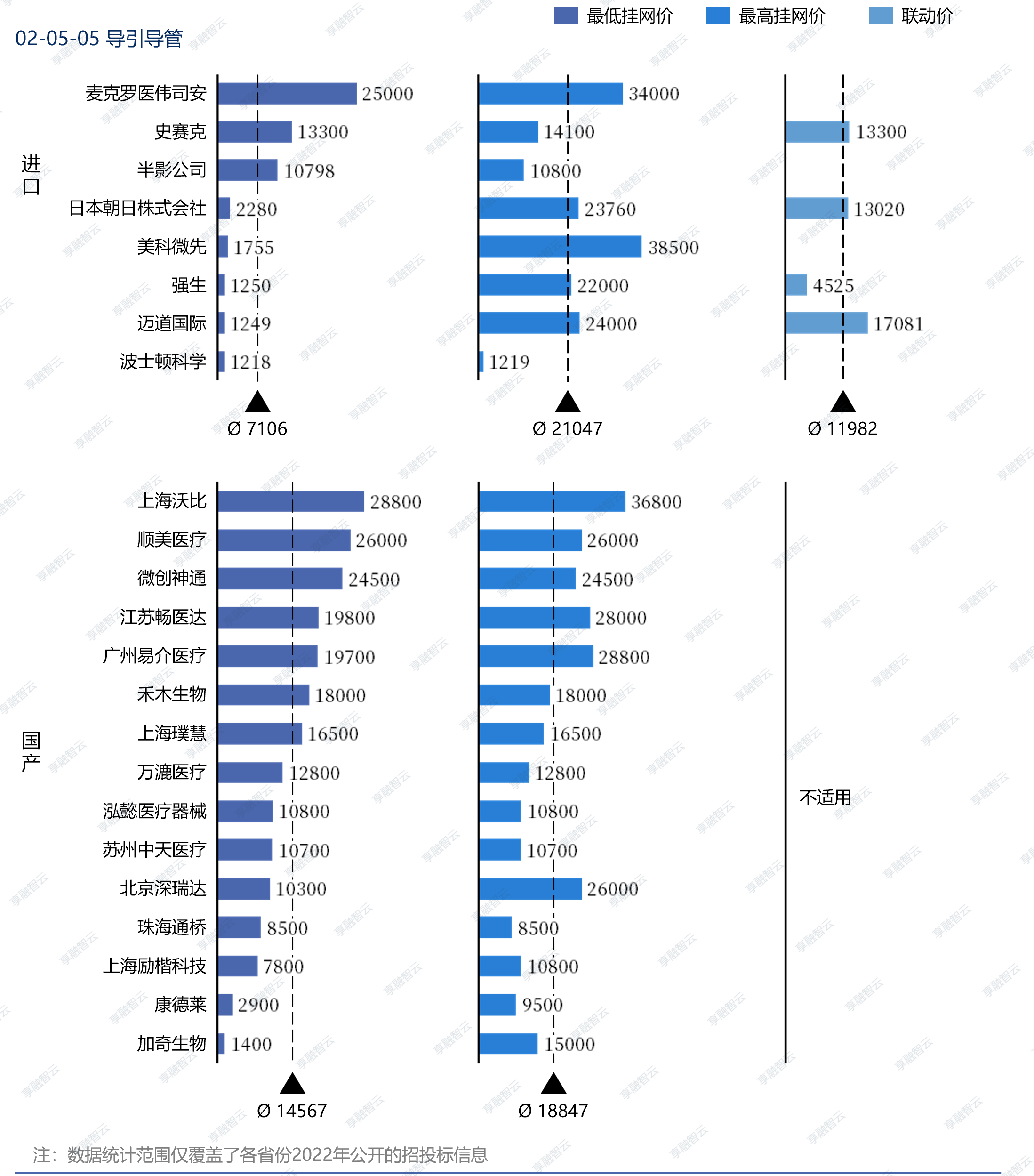 根据各省份2022年已公开的招投标信息,共获取了13个神经介入治疗导管厂家的产品定价信息,包含5家国外企业、8家本土企业。就已获取的定价信息而言,进口产品最低挂网价低于国产产品,平均值分别为19220元、27568元,国外及本土企业均有产品中选地区性带量采购。