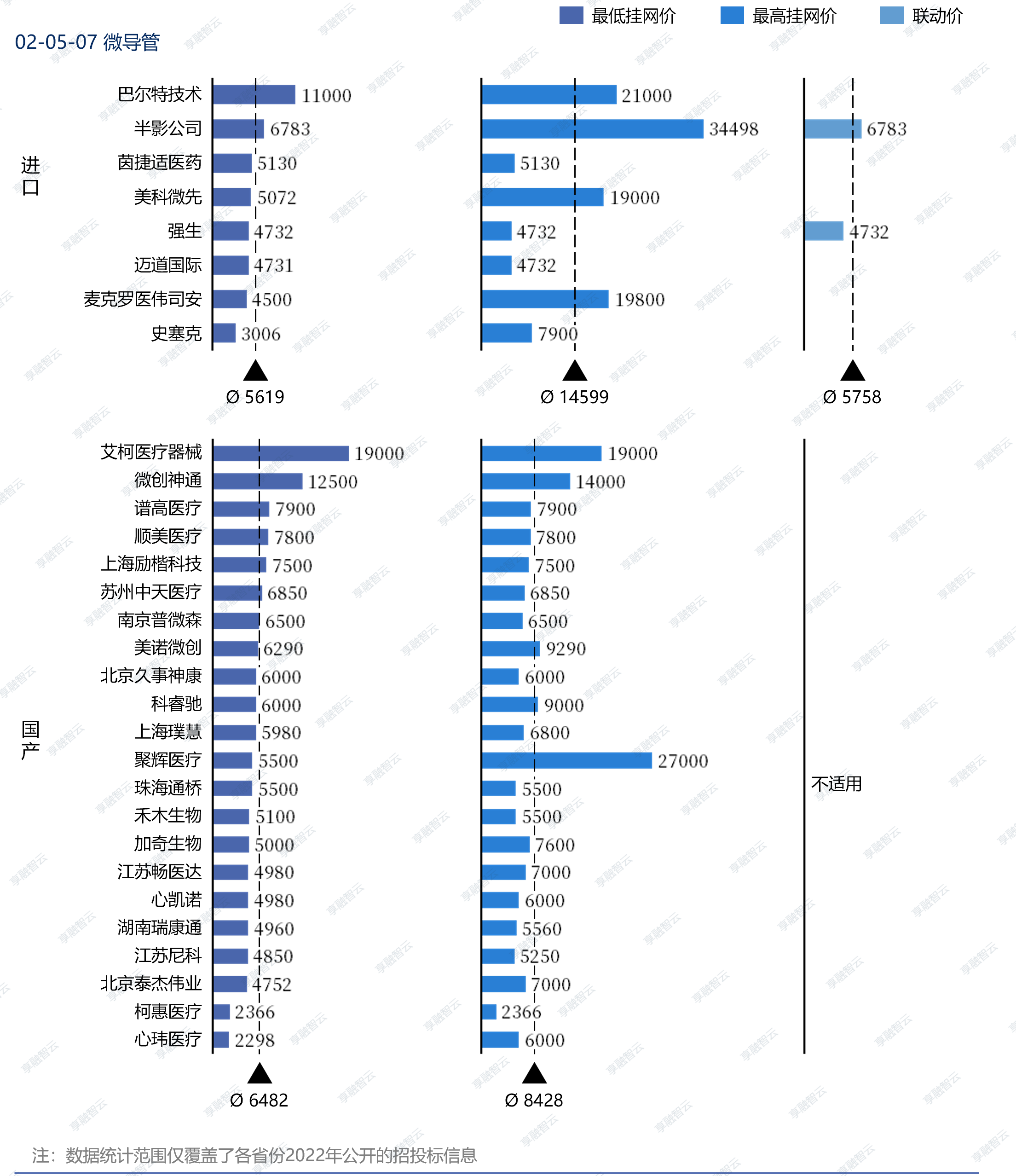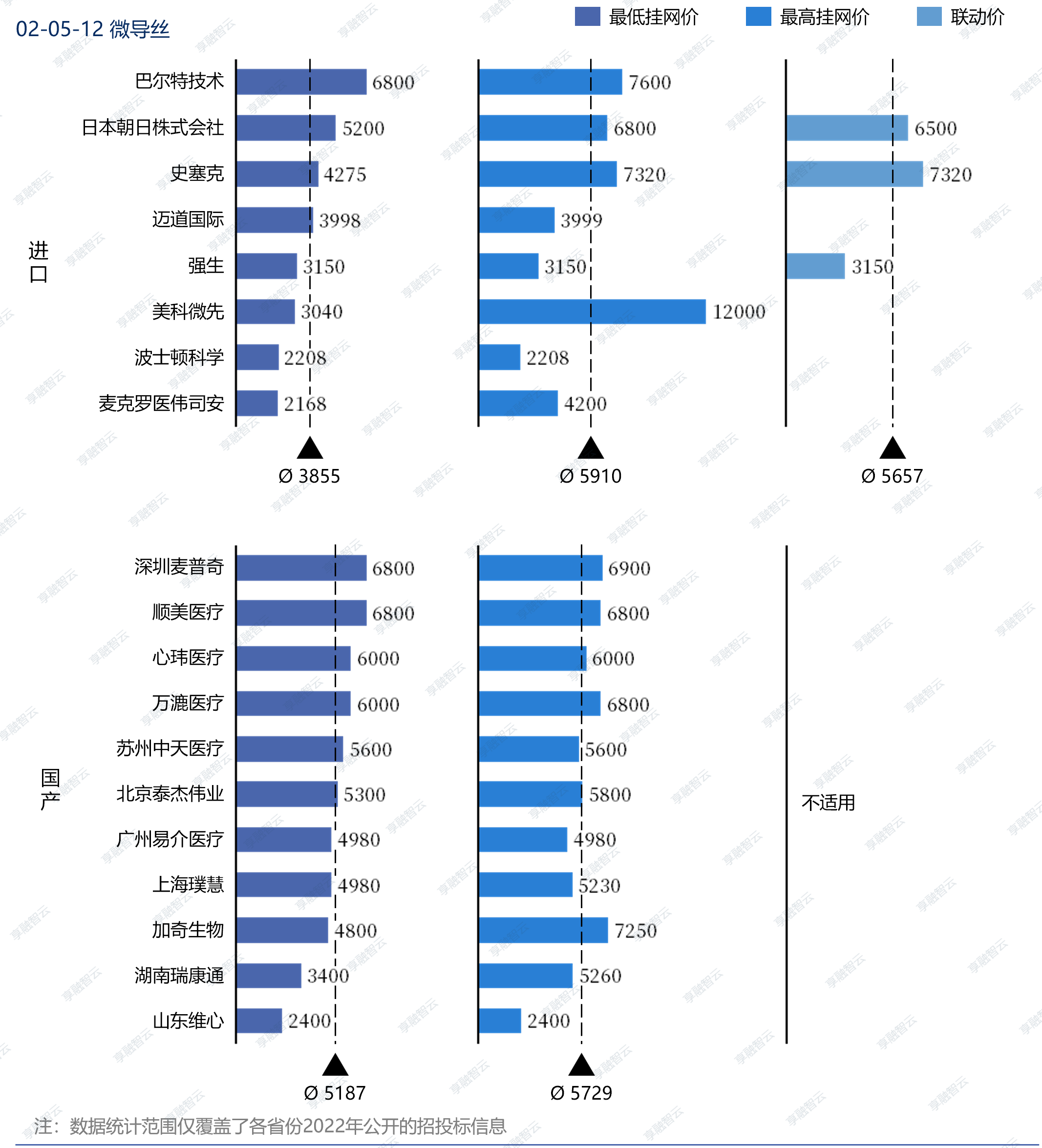 根据各省份2022年已公开的招投标信息,共获取了19个微导丝厂家的产品定价信息包含8家国外企业、11家本土企业。就已获取的定价信息而言,进口产品最低挂网价低于国产产品,平均值分别为3855元、5187元。凭借其定价优势,多款进口产品中选地区性带量采购。