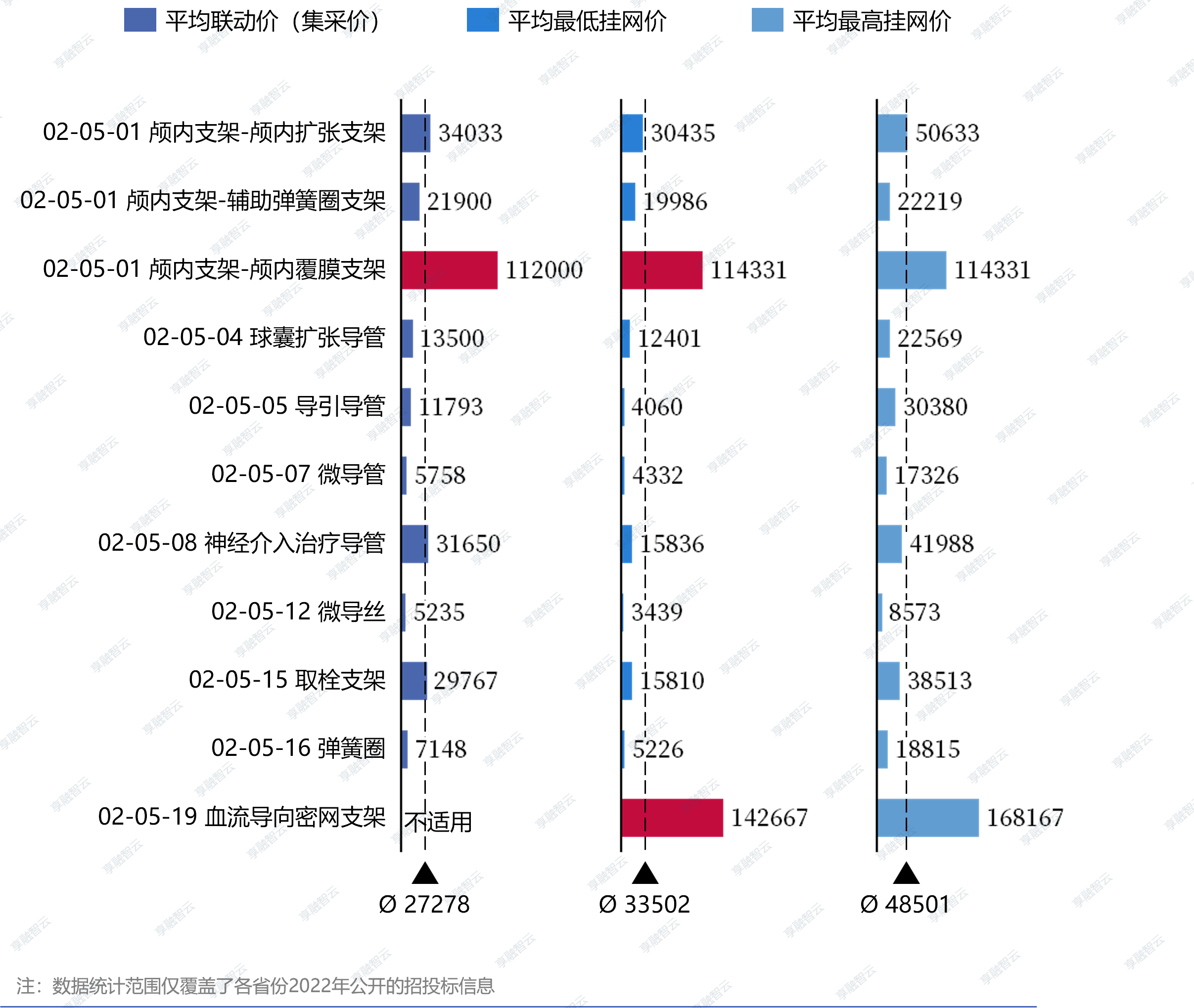根据各省份2022年已公开的招投标信息,我国各类神经介入治疗材料的联动价 (集采价)、挂网价如下所示。神介耗材平均集采价为27278元 (不含血流导向密网支架),平均最低挂网价为33502元,整体来说,神介耗材仍是高值耗材中的价格高地。
