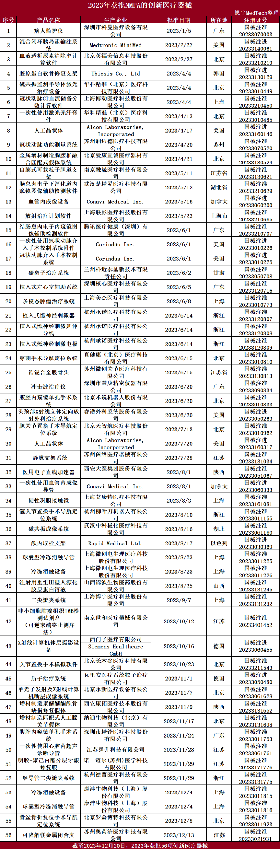 根据国家药品监督管理局(NMPA)官网公示,截至2023年12月24日,共有56款创新医疗器械在2023年获NMPA批准上市。这些创新医疗器械来自深圳科曼医疗、Medtronic MiniMed、北京英福美等公司。本文将为您盘点这些创新医疗器械,并附上相关报道,以供读者参考(按获批时间排序)