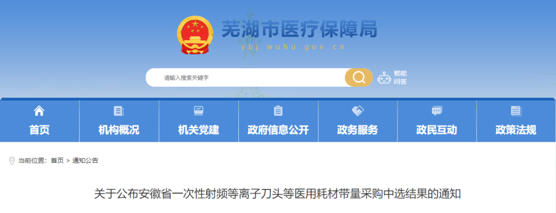 12月25日,芜湖市医保局发布了《关于公布安徽省一次性射频等离子刀头等医用耗材带量采购中选结果的通知》(以下简称《通知》)。