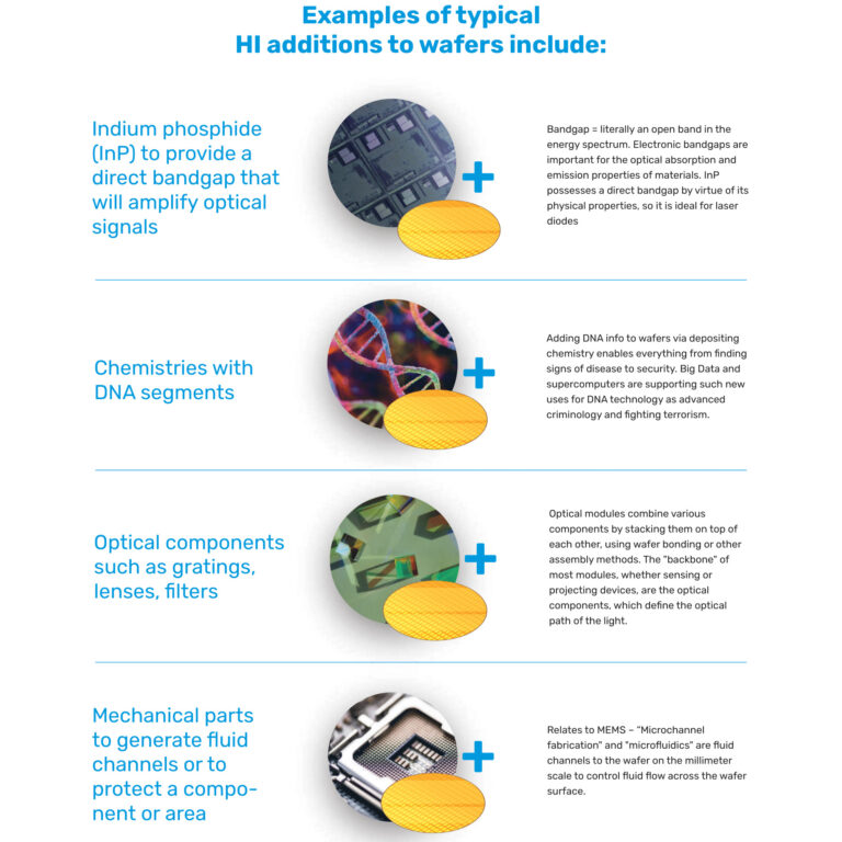 近年来,在传统的CMOS晶圆上添加材料和零件的想法已经发展到现在在晶圆上组合各种零件的地步,以大大增加芯片级别的功能。如今的CMOS晶圆通常作为一个平台,将零件和材料与CMOS电子器件相结合以增加功能。HI 一词现在通常用于描述包含非电子部件的电子设备。