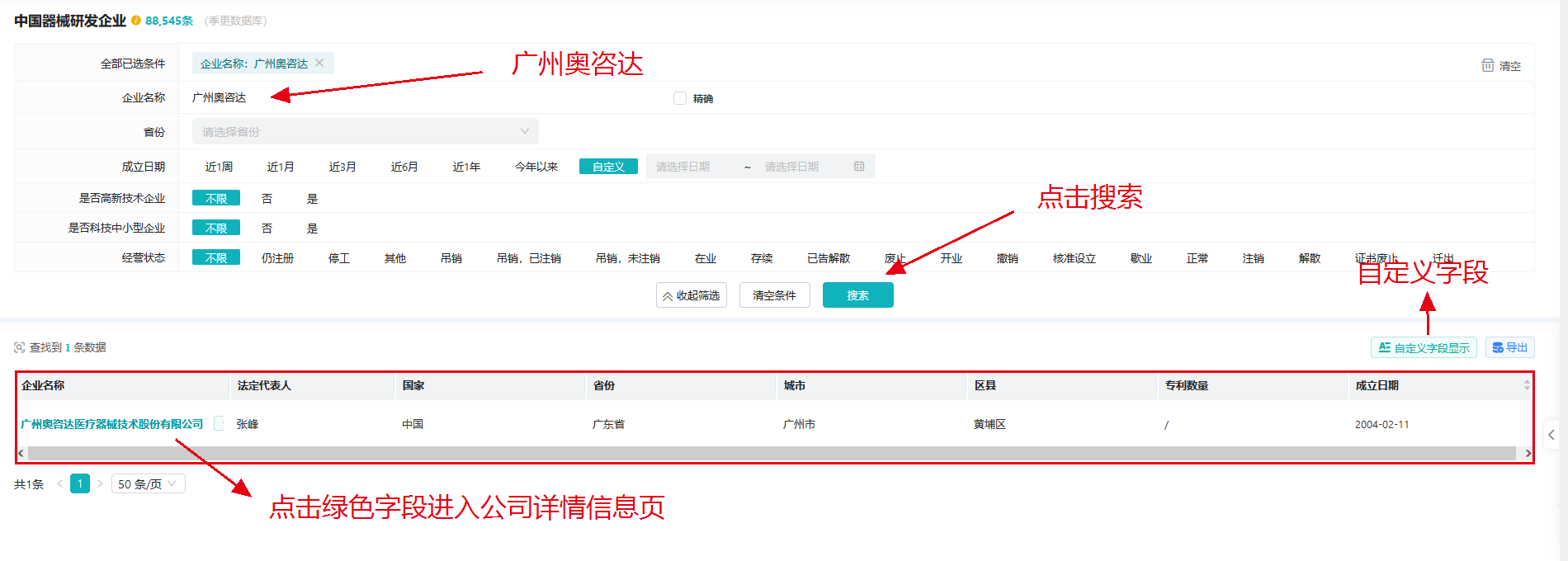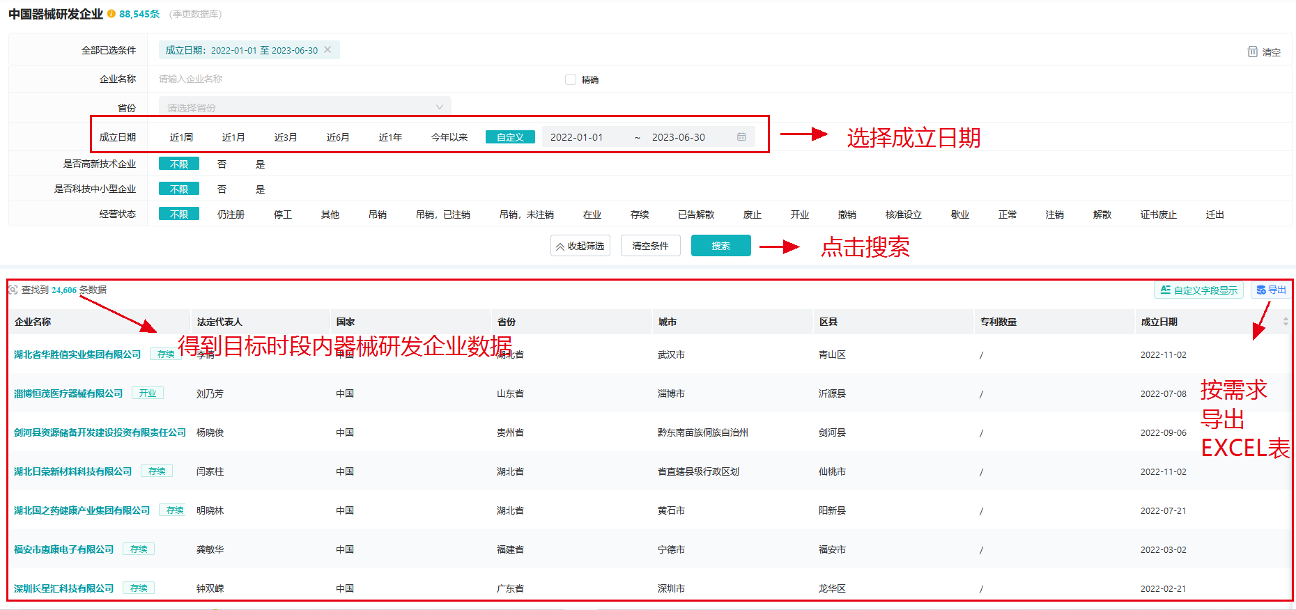 查某时间范围研发企业:---成立时间---自定义时间段:2022年1月1日至2023年6月30日---点击搜索---得到近一年成立的全国医疗器械研发企业