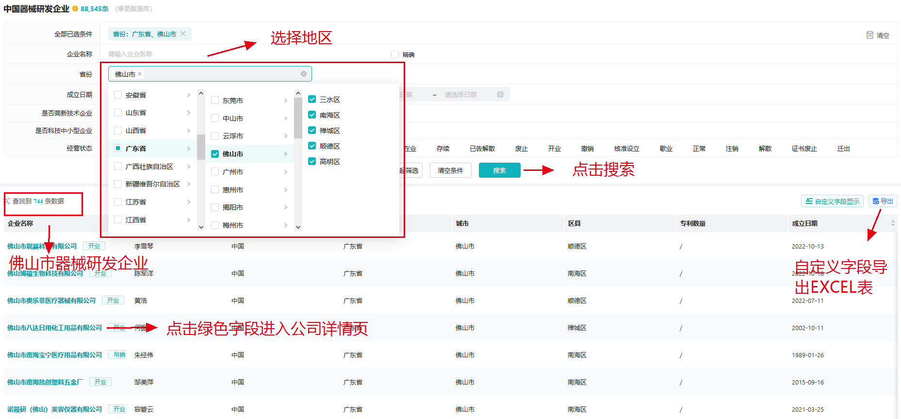 查某地区研发企业:---点击省份---选择广东省佛山市---点击搜索---得到所有佛山市医疗器械研发企业---可选择导出数据excel表格,或进入详情页查看地址联系方式等具体信息