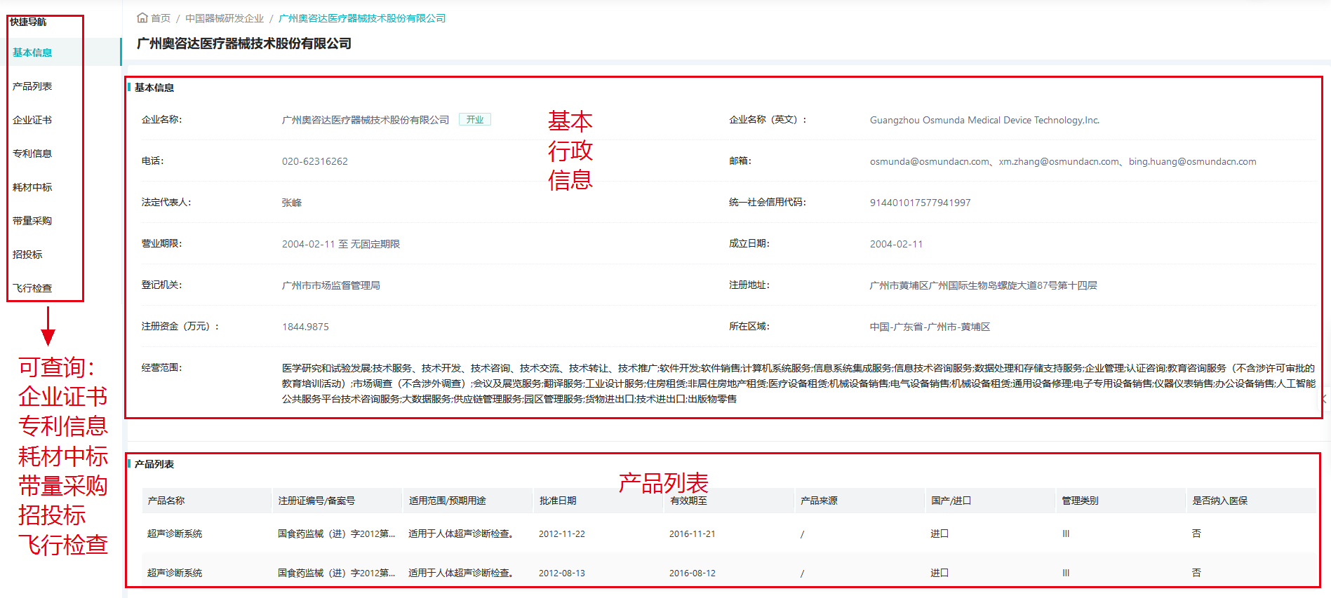 通过数屿医械中国医疗器械研发数据库的企业检索结果页面,用户可以直观地展示医疗器械研发企业的行政信息、产品信息、资质证书、专利、招投标、飞行检查、耗材中标等信息。这些数据都可以被准确找到,相对来说比较真实可靠。对于全面深入了解企业或查询目标区域的企业名录都非常方便,可以为业务推进和选择决策提供更多支持。