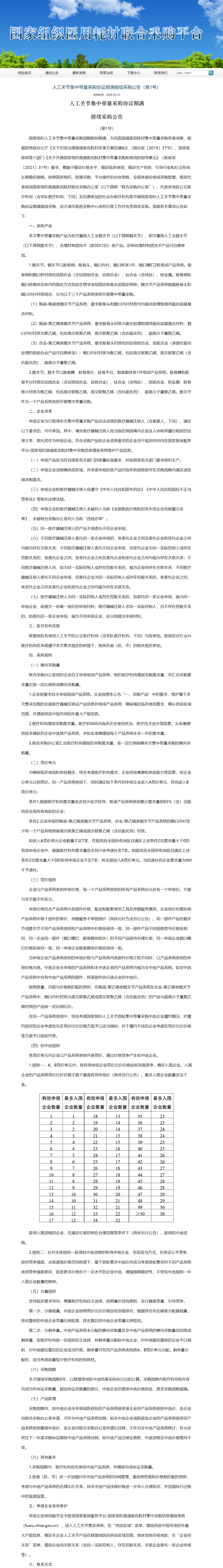 2024年2月23日,国家组织高值医用耗材联合采购办公室发布《人工关节集中带量采购协议期满接续采购公告(第1号)》。